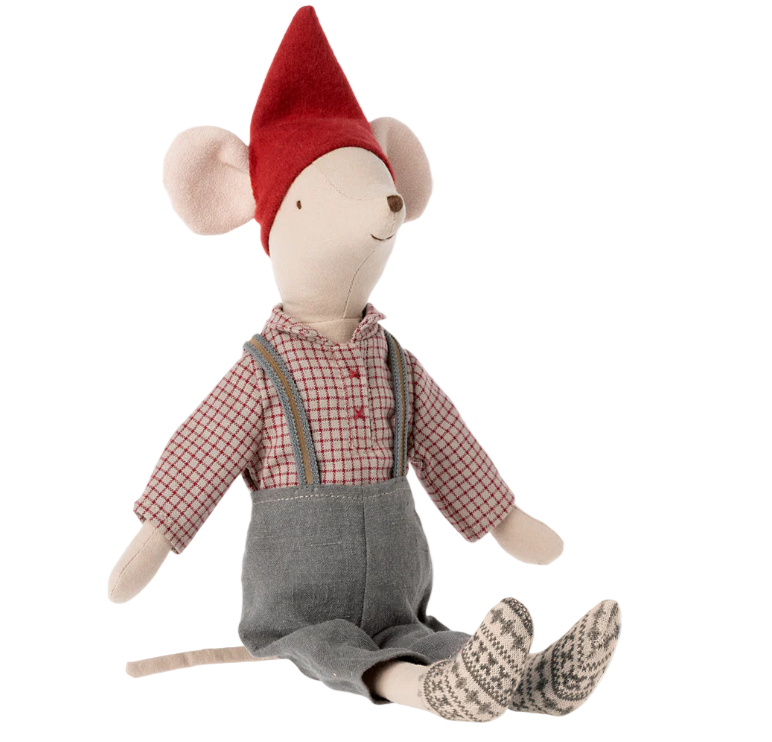 A classic mouse in size medium dressed in cozy Christmas clothes. Use them for play or as a part of your home decoration during December. His hat is removable so when the season is over you can change his clothes and he is ready for more play.