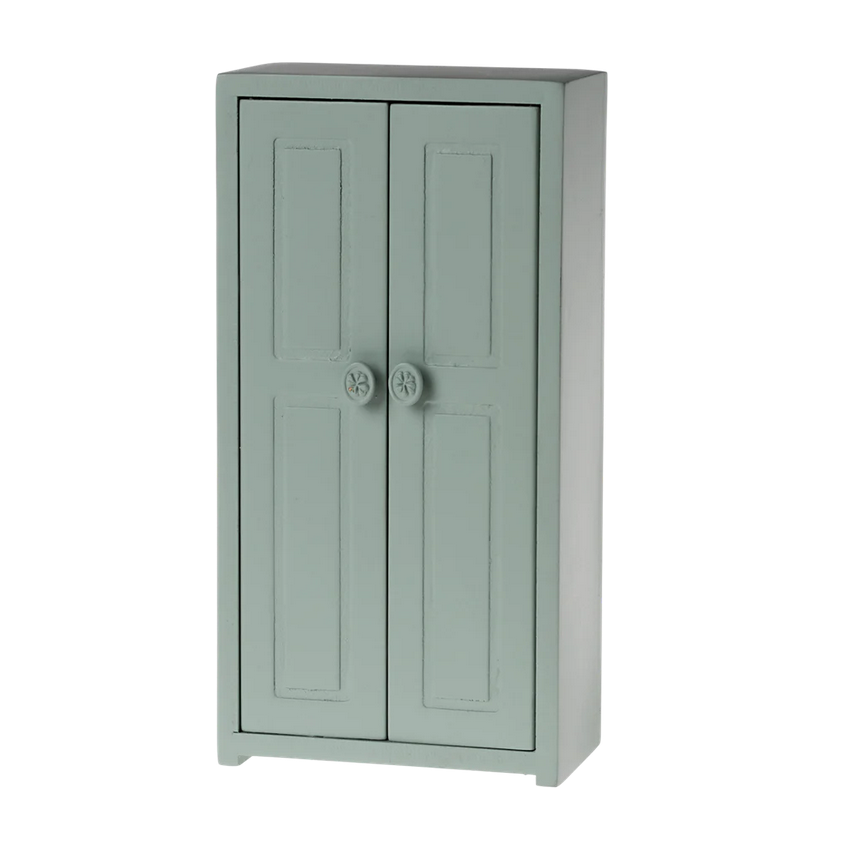A small closet helps the mice family organize their wardrobe. The closet comes with three golden hangers.