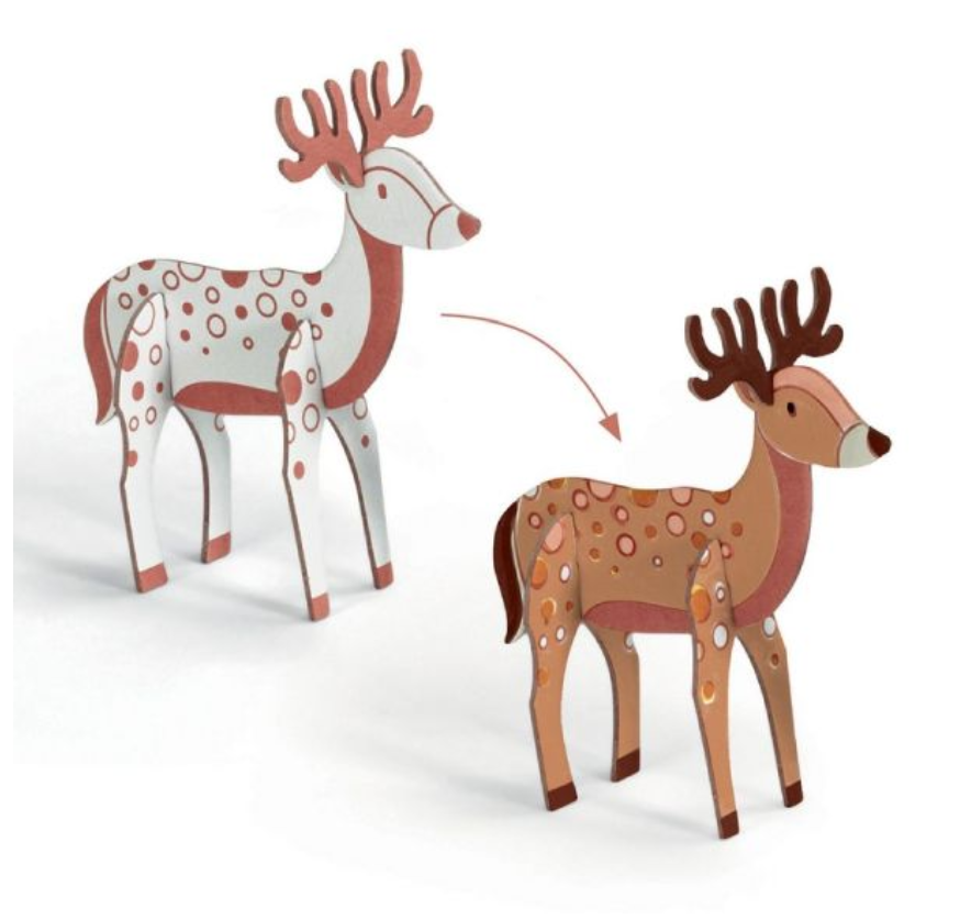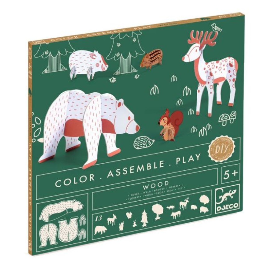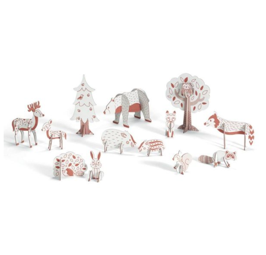 A creative kit with a multitude of cardboard pieces to colour and assemble to create forest animals and scenery. The child plays with all the elements he or she makes and it's the start of fabulous stories!