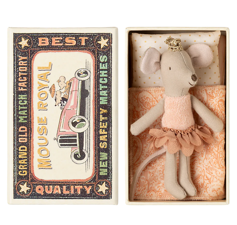 A classic Maileg item. This mouse is ready for hours of play and sleeps tight in a little matchbox. The clothes and bed linen come in unique prints and beautiful colors. Bed linen may vary in color.