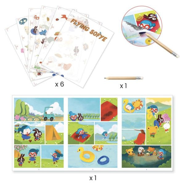 This pack invites children to create a comic strip with funny and endearing characters using decals: they rub the images with the pencil and the image is transferred to the accordion board. Step by step, children position the elements on the illustrated boards to complete the story as it takes shape before their eyes.