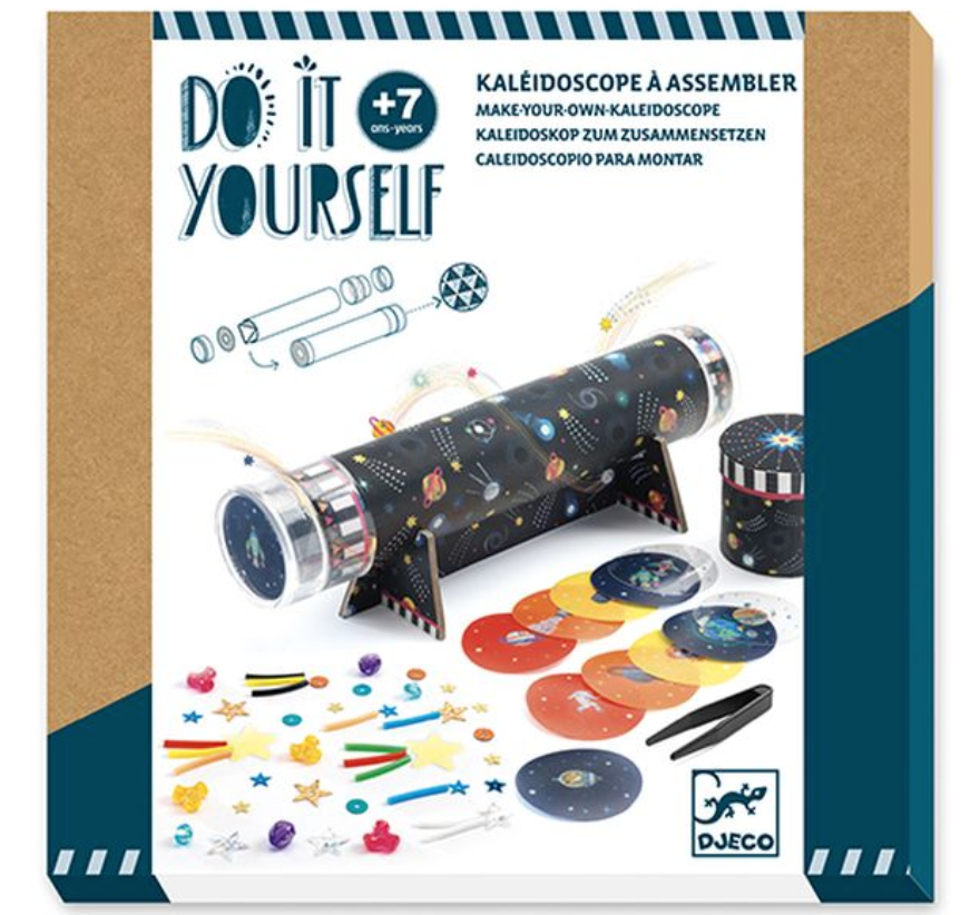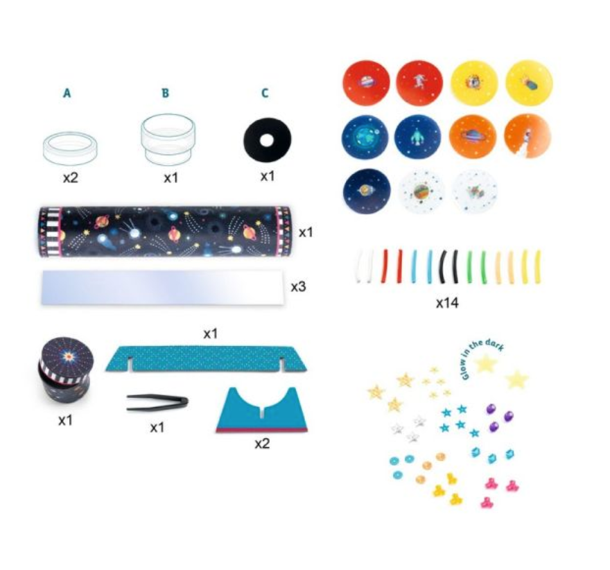 A complete creative kit for making a space-themed kaleidoscope. Children follow the instructions and assemble the pieces according to the guide, then use the 50+ accessories provided to try different pattern combinations (glow-in-the-dark stars, disks illustrated with space ships, planets, etc) to totally immerse themselves in the theme!
