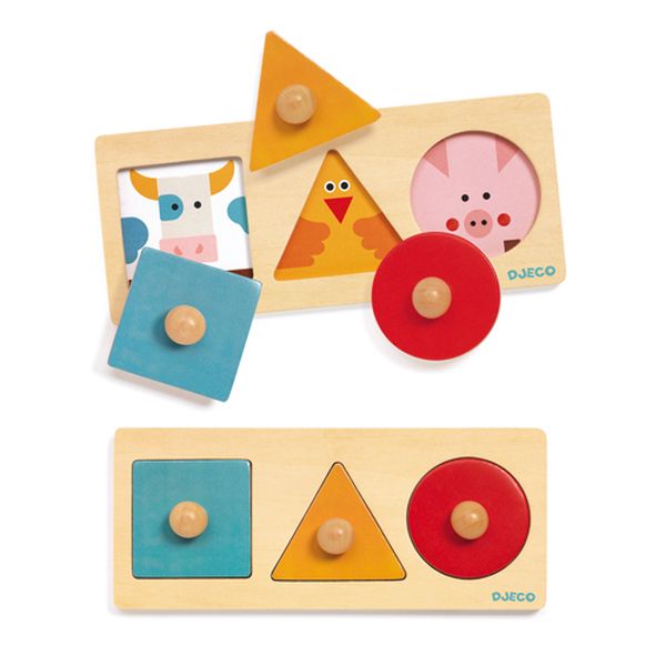 A wooden puzzle for young children to learn geometric shapes and colours. Children can have fun hiding the animals by placing the shapes in the right places. And they get a surprise when they lift the pieces! They rediscover the little animals under each piece.