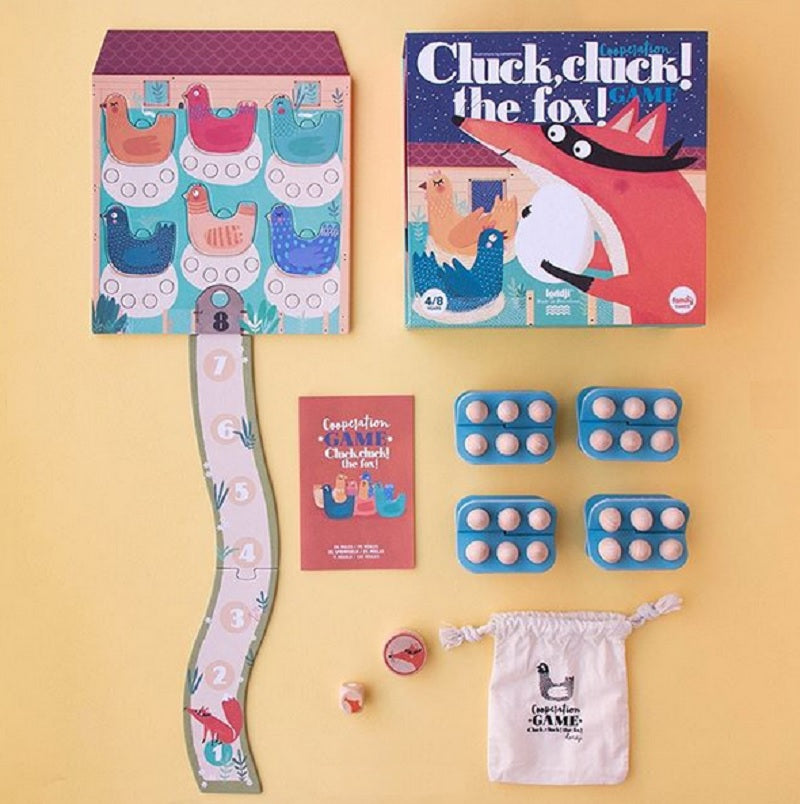 Cluck, Cluck! the Fox! Cooperative Game featuring illustrations by Txell Darne / Can Seixanta. Help the farmer protect the henhouse from the hungry fox!