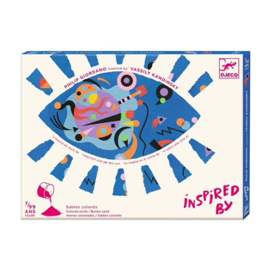 A coloured sand activity with illustrations inspired by the style of Wassily Kandinsky, a great master of abstract art. Children place the picture in the box, use the tool provided to expose the pre-pasted areas, and sprinkle over the sand following the colour-coded instructions. The free forms thus created seem to be playing with our emotions.