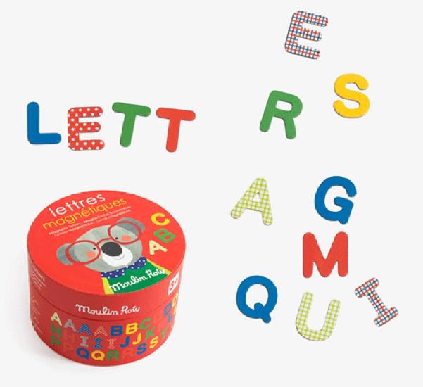 Dans un joli coffret rond, 54 lettres en carton aimantées, d'environ 4 cm, aux couleurs primaires, pour apprendre l'alphabet et écrire ses premiers mots en s'amusant.