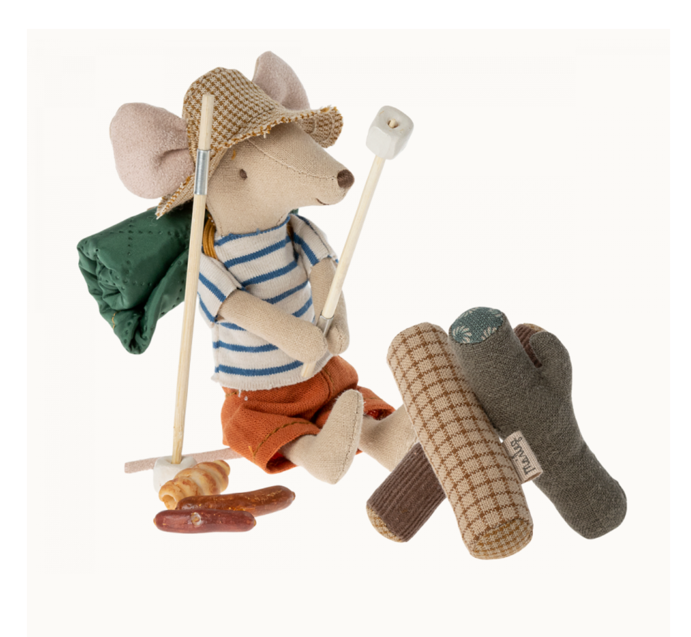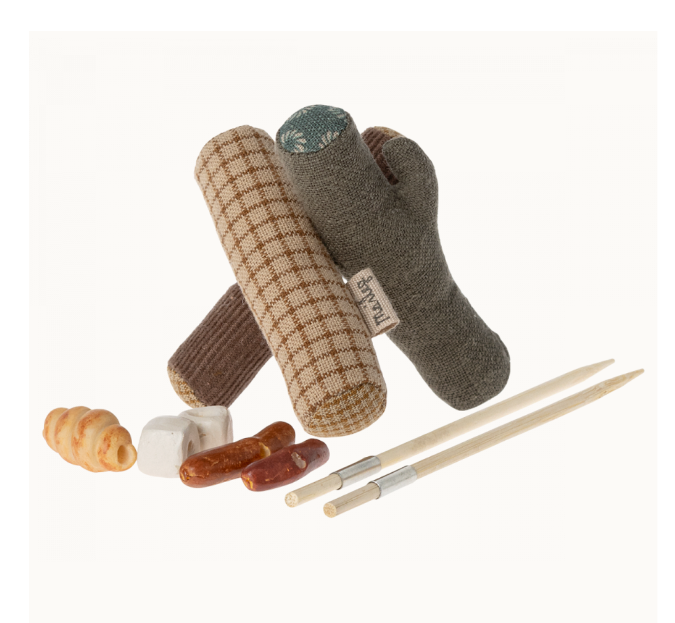 When the hiking mice are out on a trip, they love to sit by the fire and prepare their food. This set comes with sticks, food, and branches. The sticks have a small metal part so the hiking mice can hold the sticks with their magnet paws.