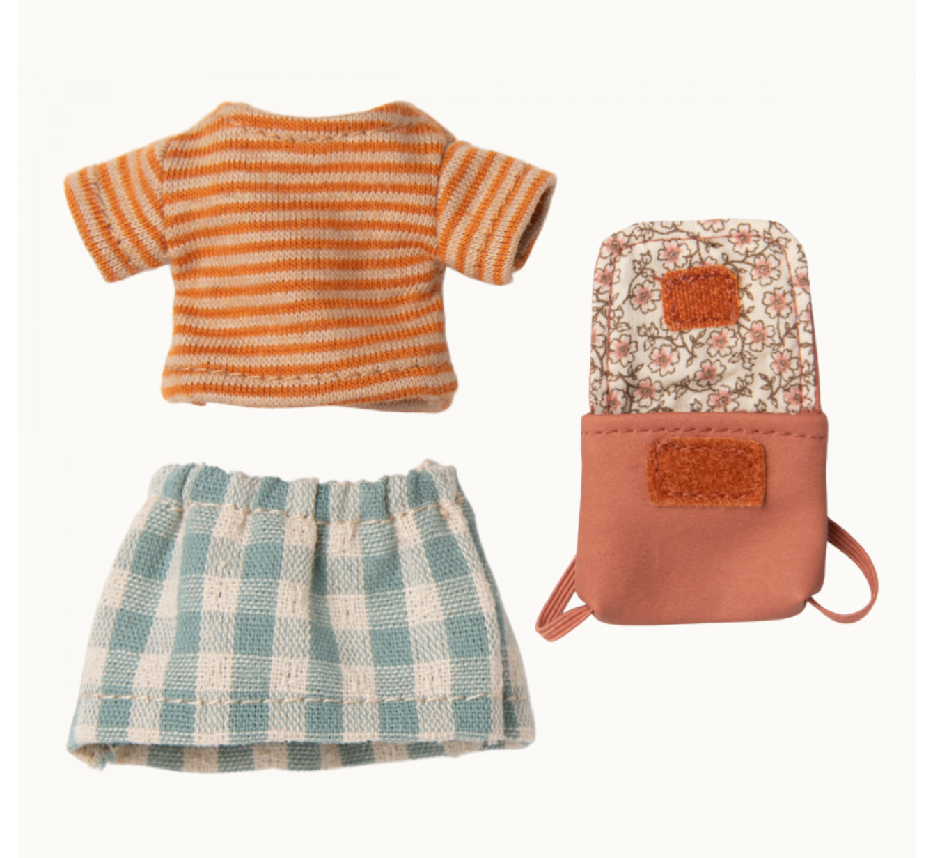 A loose set of clothes for mouse size big sister/brother mouse. This set includes a skirt, a shirt and a backpack.