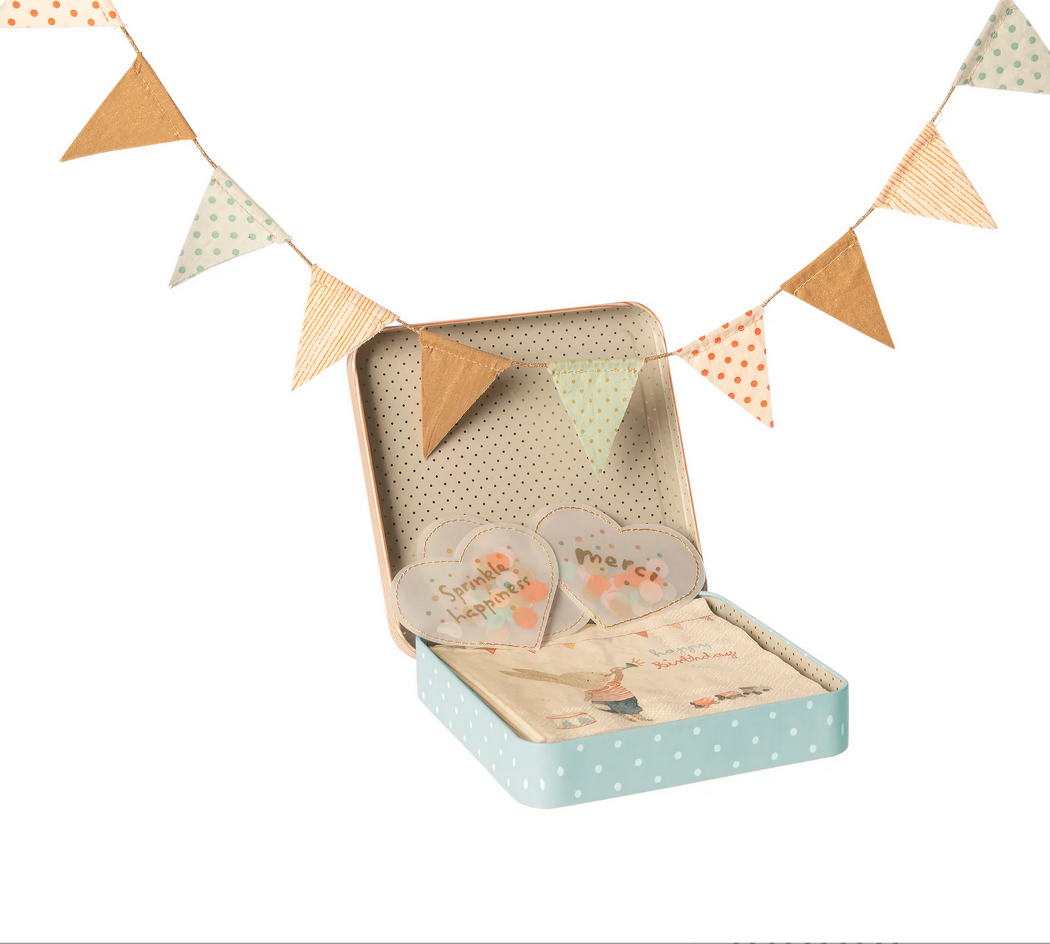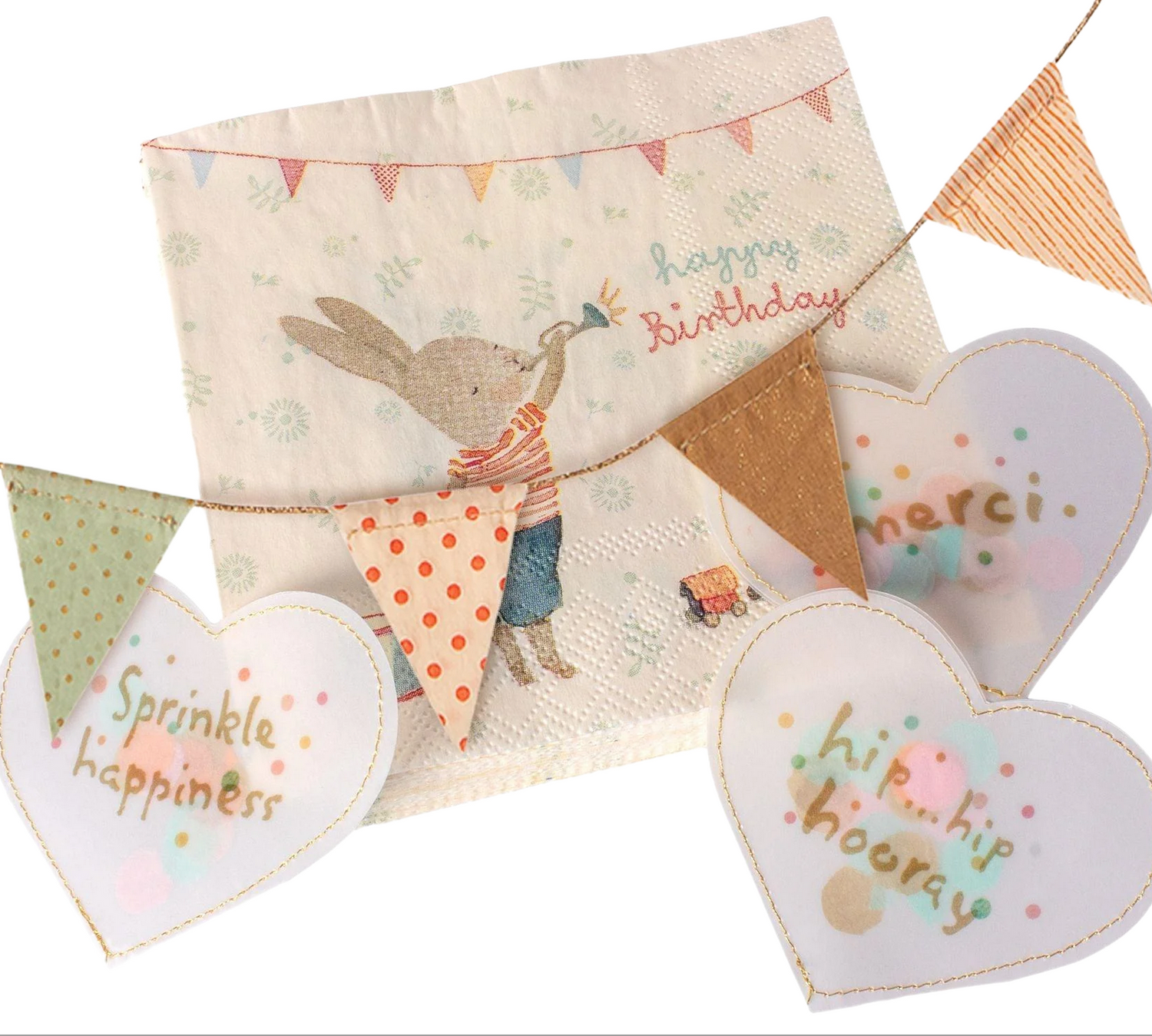 The perfect party kit for a happy day! This set includes everything you might need to decorate a beautiful table for your next Maileg party. 16 festive napkins, a garland and confetti hearts.