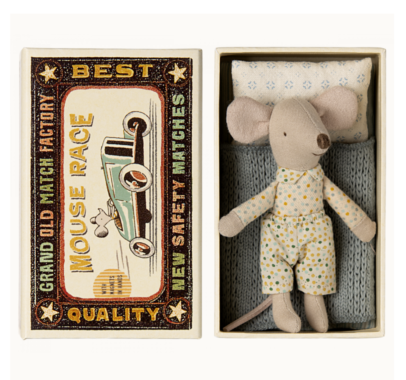 A classic Maileg item. This mouse is ready for hours of play and sleeps tight in the little matchbox. The clothes and bedlinen are made of soft fabrics with unique prints in beautiful colors. Extend the story by adding accessories to the play.