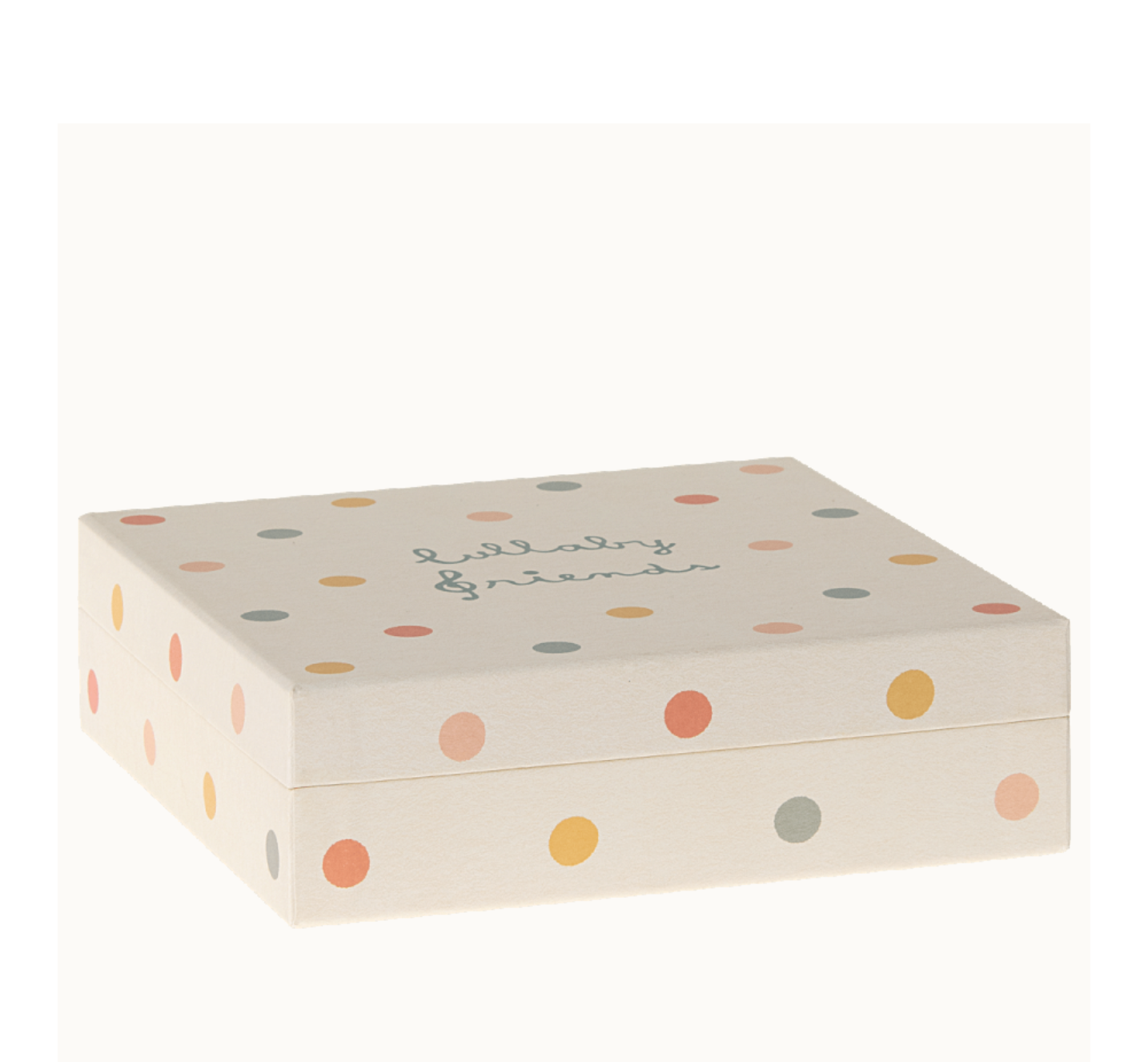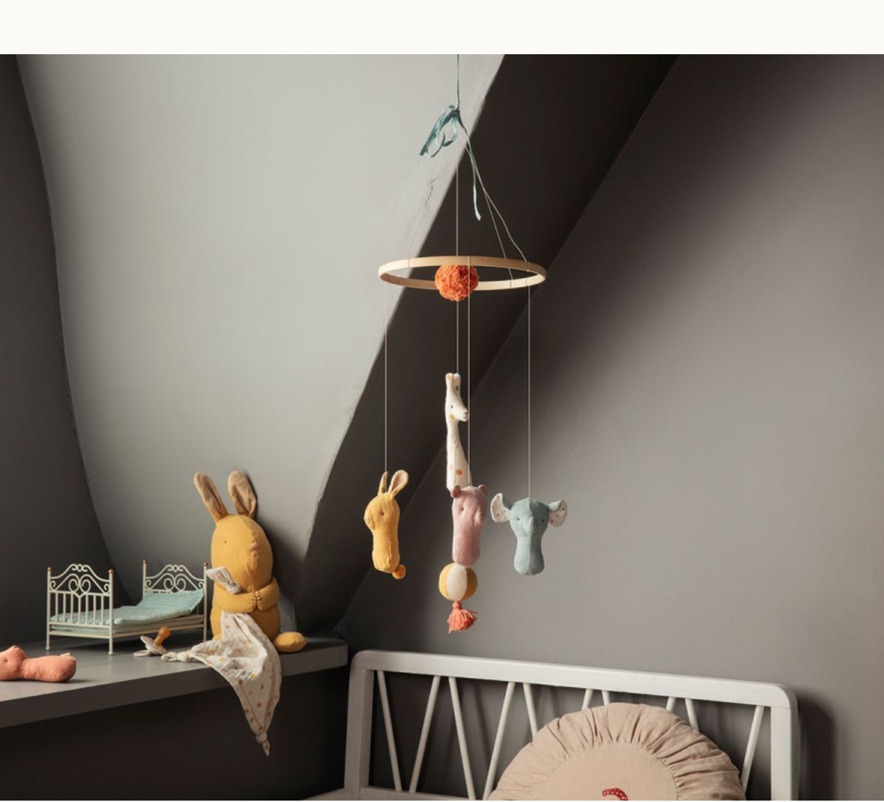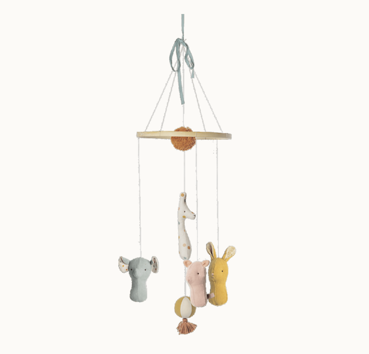 Lullaby friends is a collection with beautiful baby items. This mobile is perfect for the baby to look at from the bed or from the nursery table. The animals are made in soft fabrics with unique prints and are packed in a beautiful gift box.