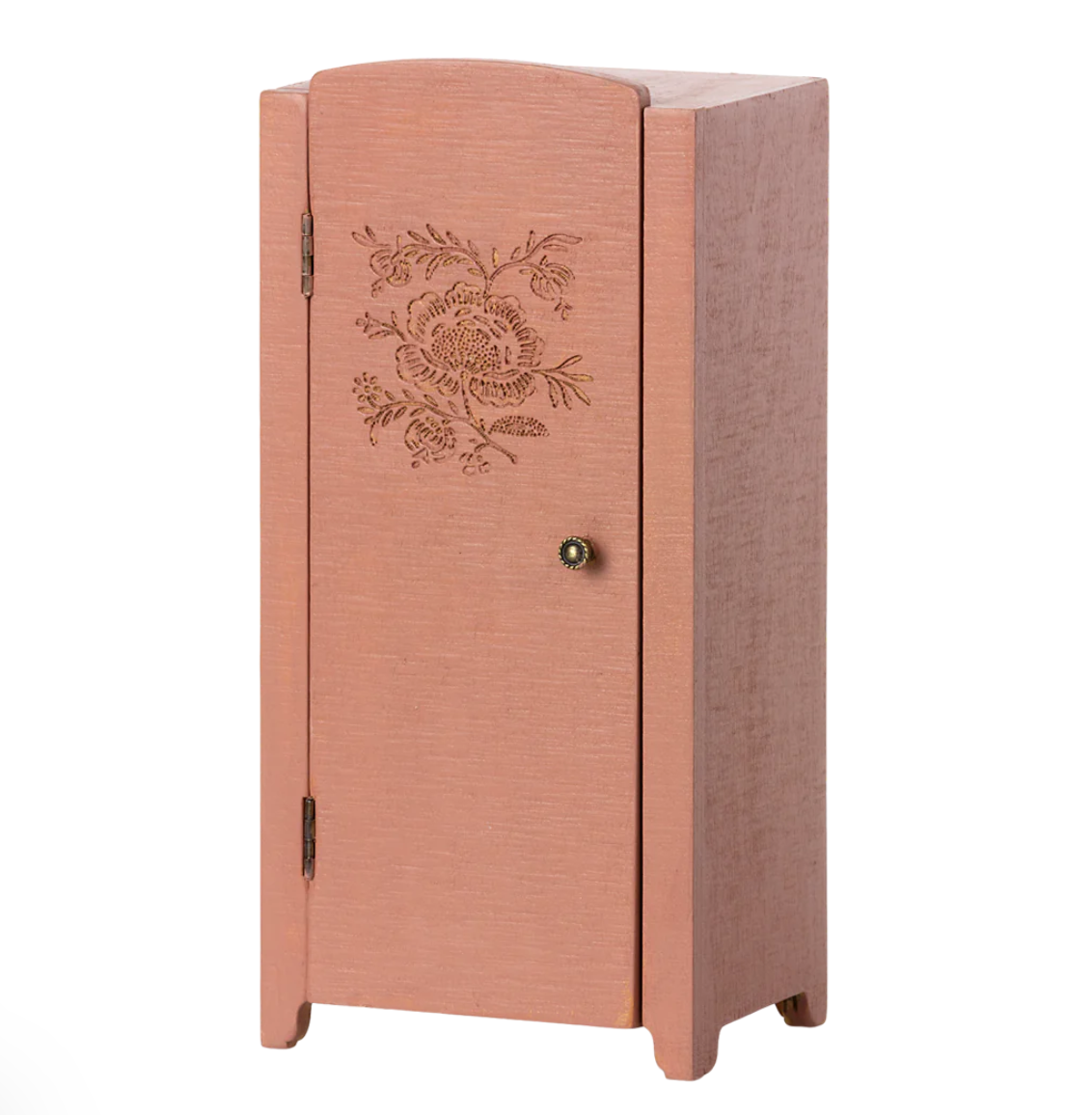 This vintage looking closet has a beautiful embossed flower print on the front and beautiful printed wallpaper inside. The shelves inside will make sure the organizing play will begin. This closet fits into the Maileg dollhouse.