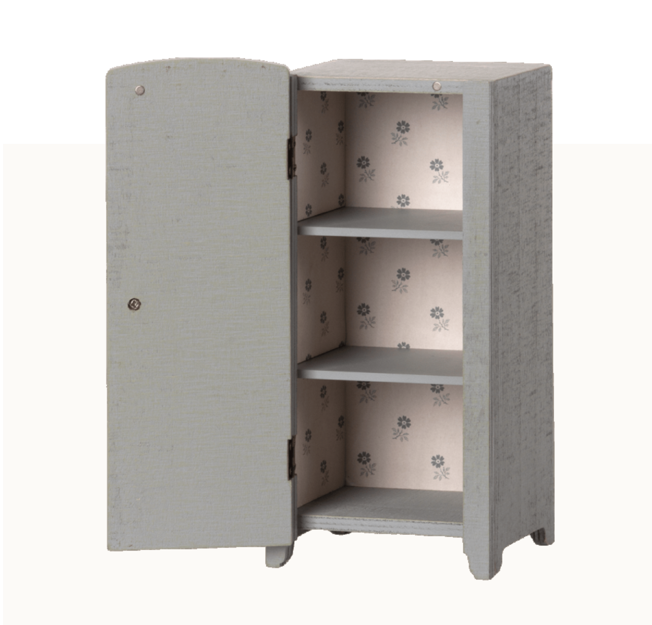 This vintage looking closet has a beautiful embossed flower print on the front and beautiful printed wallpaper inside. The shelves inside will make sure the organizing play will begin. This closet fits into the Maileg dollhouse.