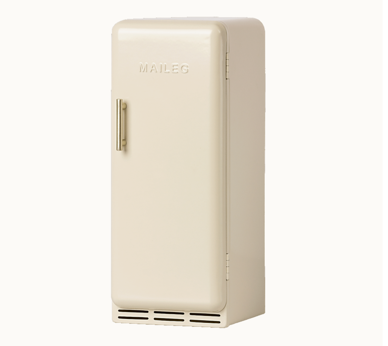 An old fashioned fridge that fits perfectly into the House of miniature dollhouse. The fridge is made in metal with magnetic lock and frosted shelves inside.