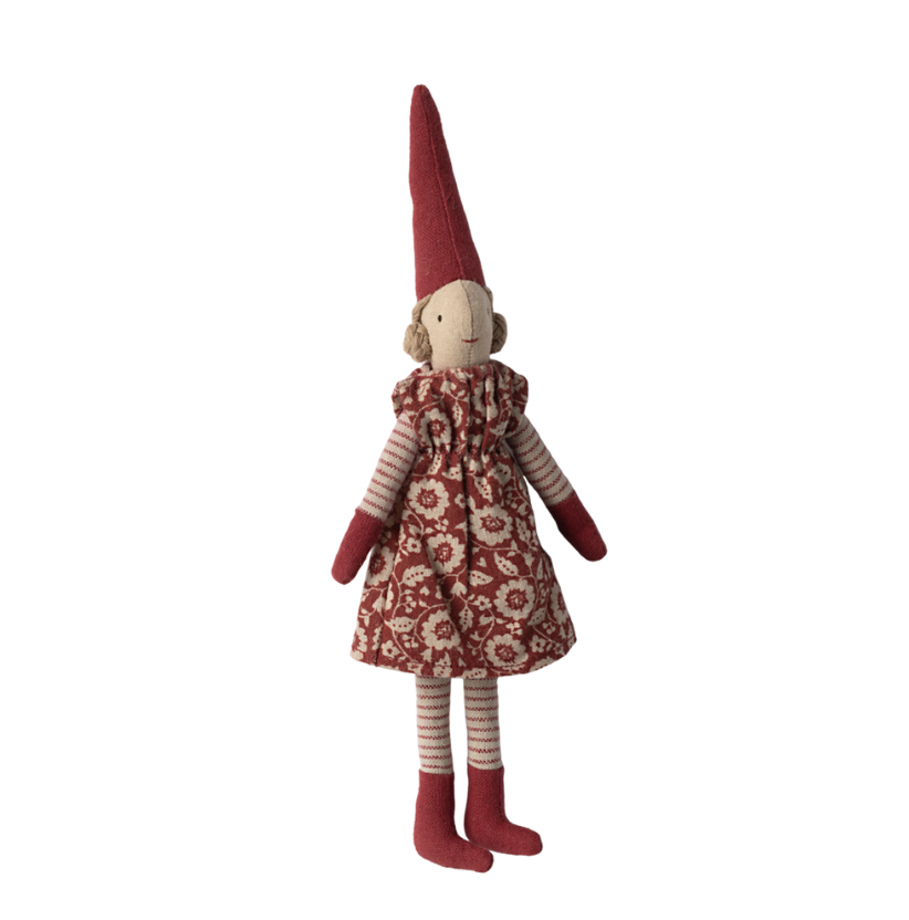 Mailegs pixy collection contains many different styles - all dressed up in nice Christmas clothes made of exclusive materials. They are adorable and can be mixed and matched across sizes and collections. Size 1 has magnet in hands and left foot.