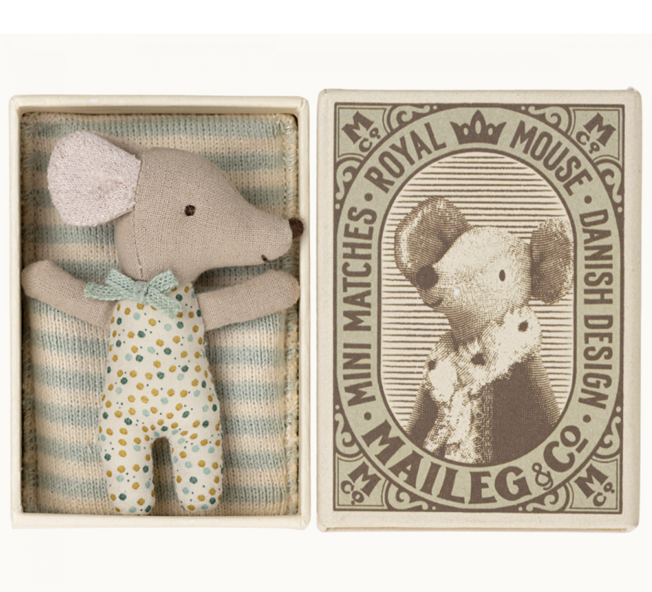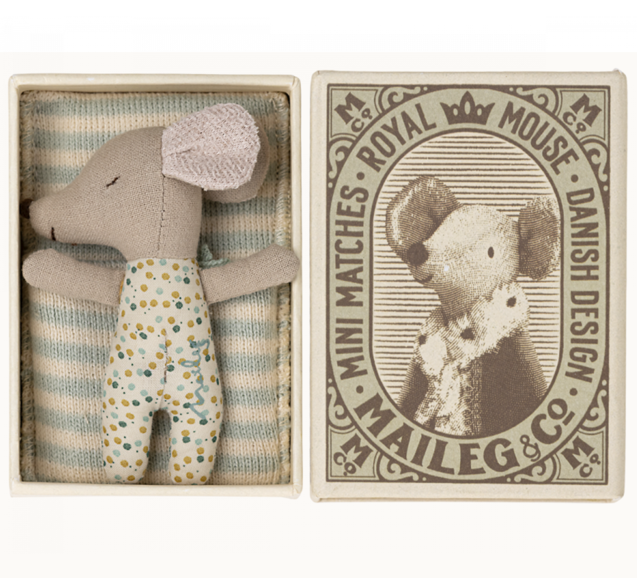 A classic Maileg item. This mouse is ready for hours of play and sleeps tight in the little matchbox. The clothes and bedlinen are made of soft fabrics with unique prints and beautiful colors.