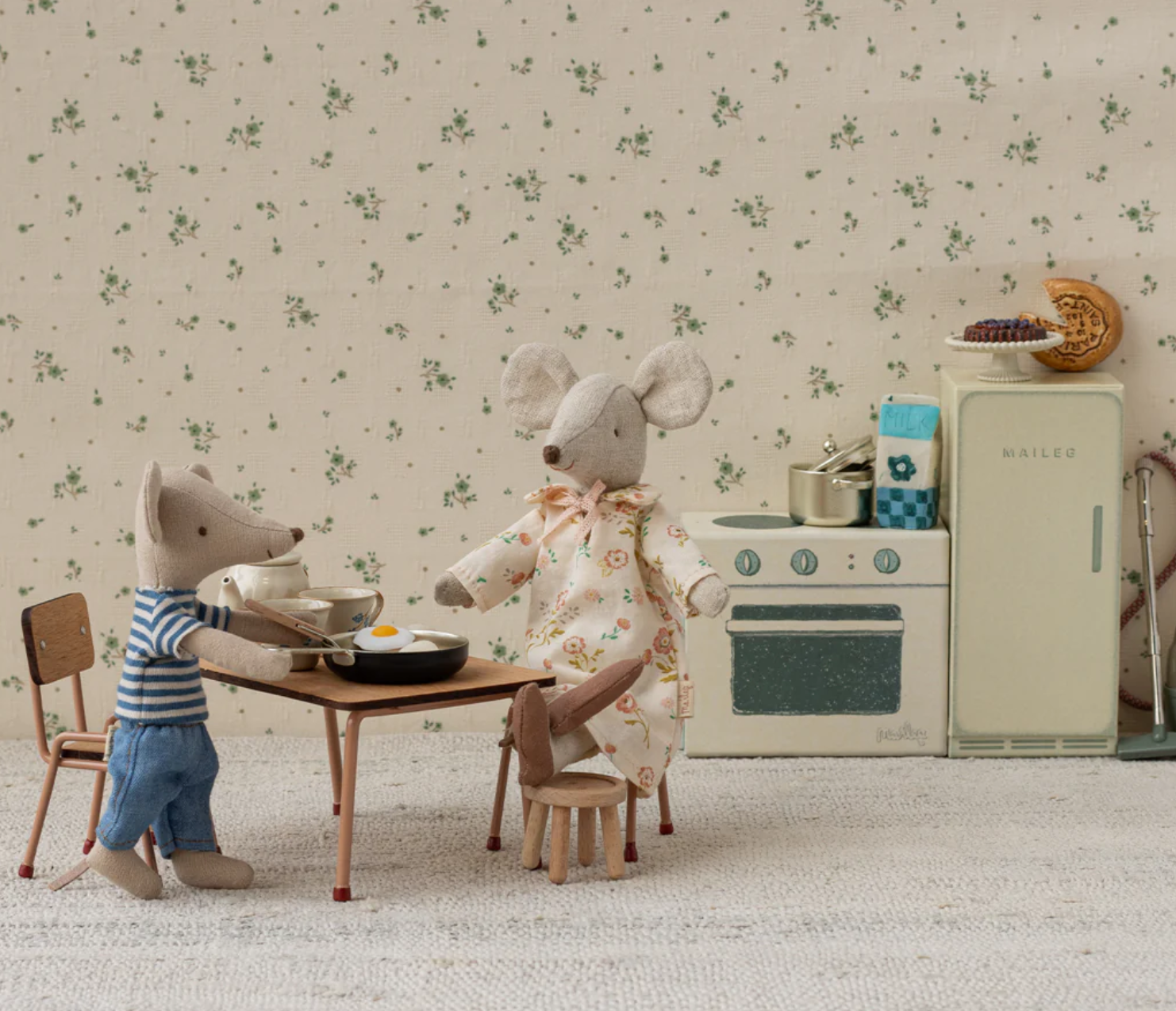 Table and chair set that fits the Mouse hole Farmhouse. It is made in beech wood with metal legs. Please notice the handmade color details on the feet of the legs - both on the table and the chairs. The set comes with 2 chairs.