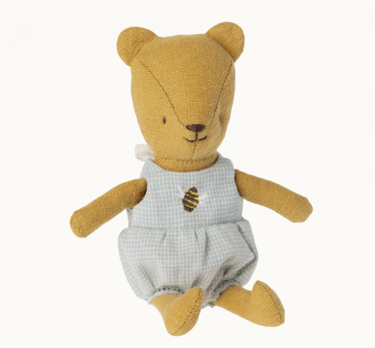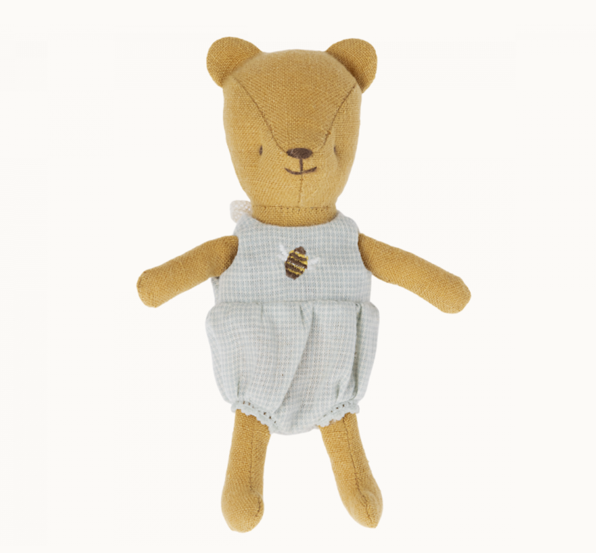 A baby has arrived to the teddy family. It is made in same soft linen fabric as the rest of the teddies, it comes dressed in a small suit with embroider