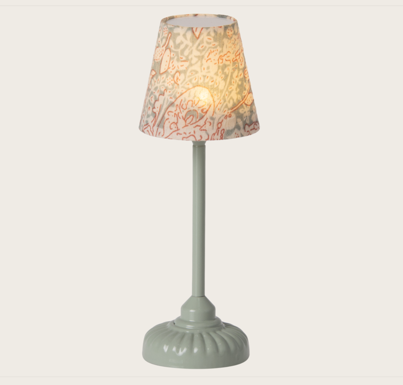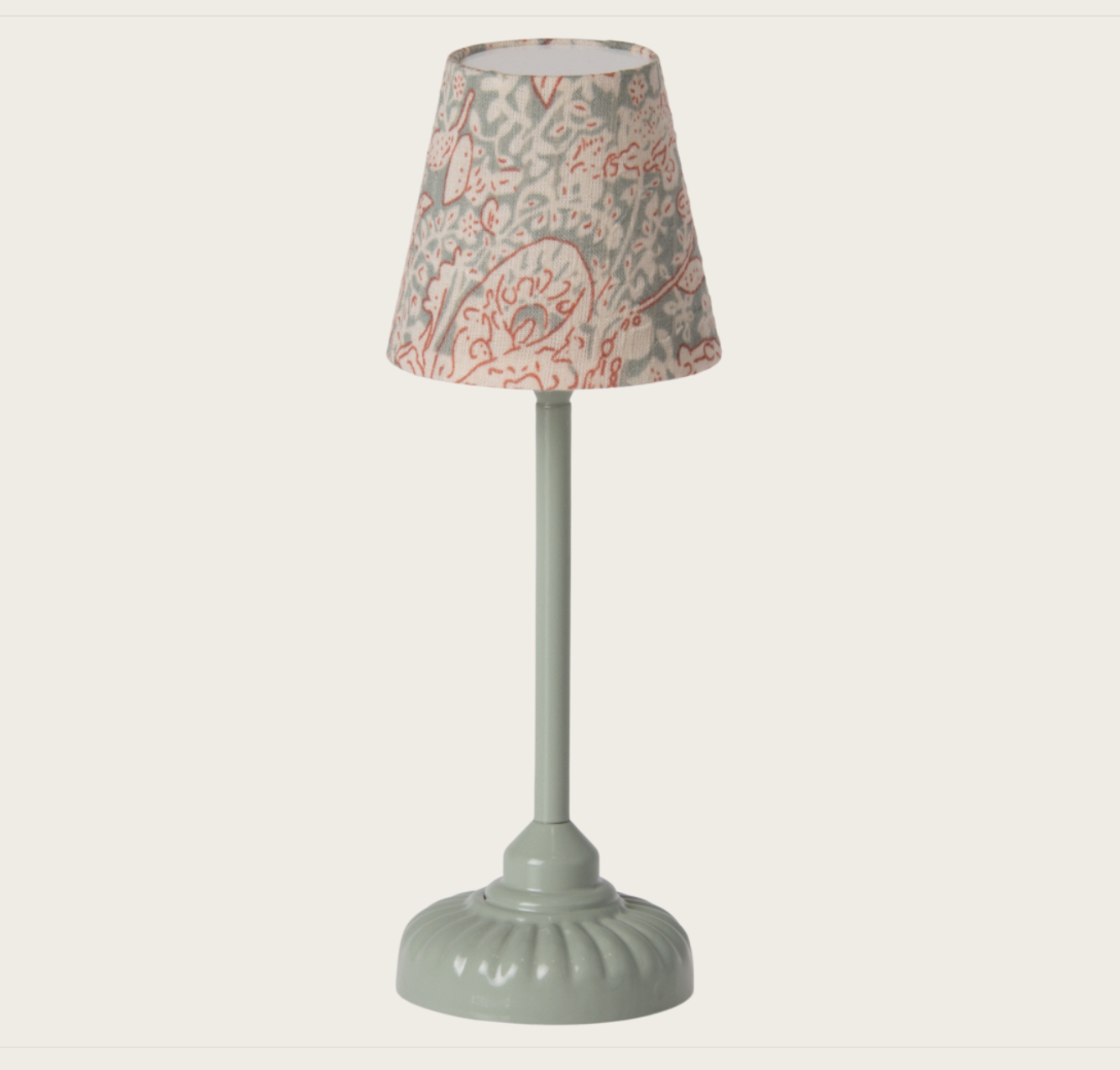 The beautiful Maileg vintage floor lamp is a must-have. The lamp will light up the room with a soft tone - remember to turn off the light when our friends go to bed. The product comes without battery. You can add a coin cell battery (CR1632).
