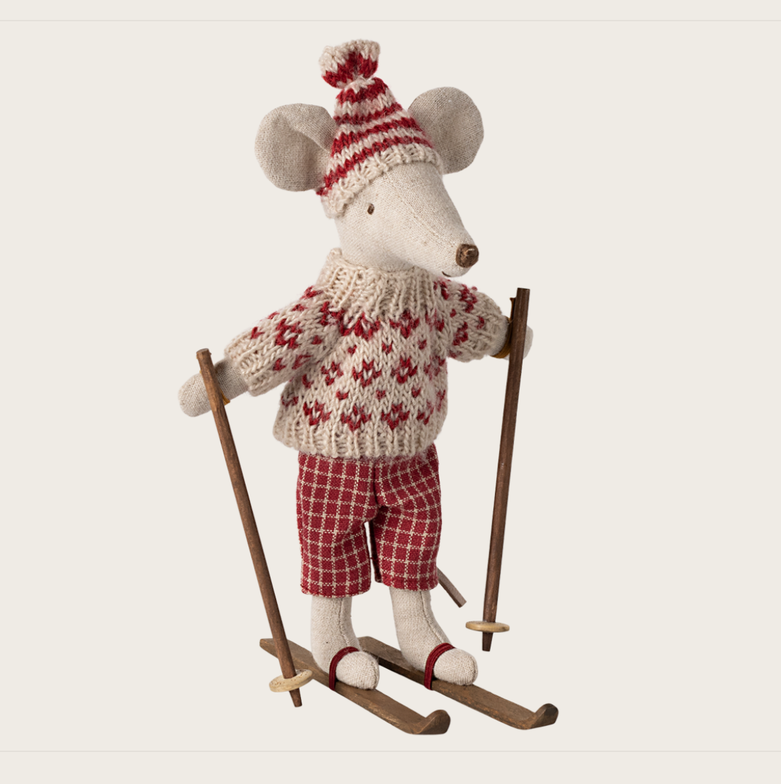 A mouse ready for hours of fun on the slopes during the cold wintertime. Each playset contains a warmly dressed mouse with a pair of ski and poles. Look at the tiny knitted hat that will keep the ears warm.
