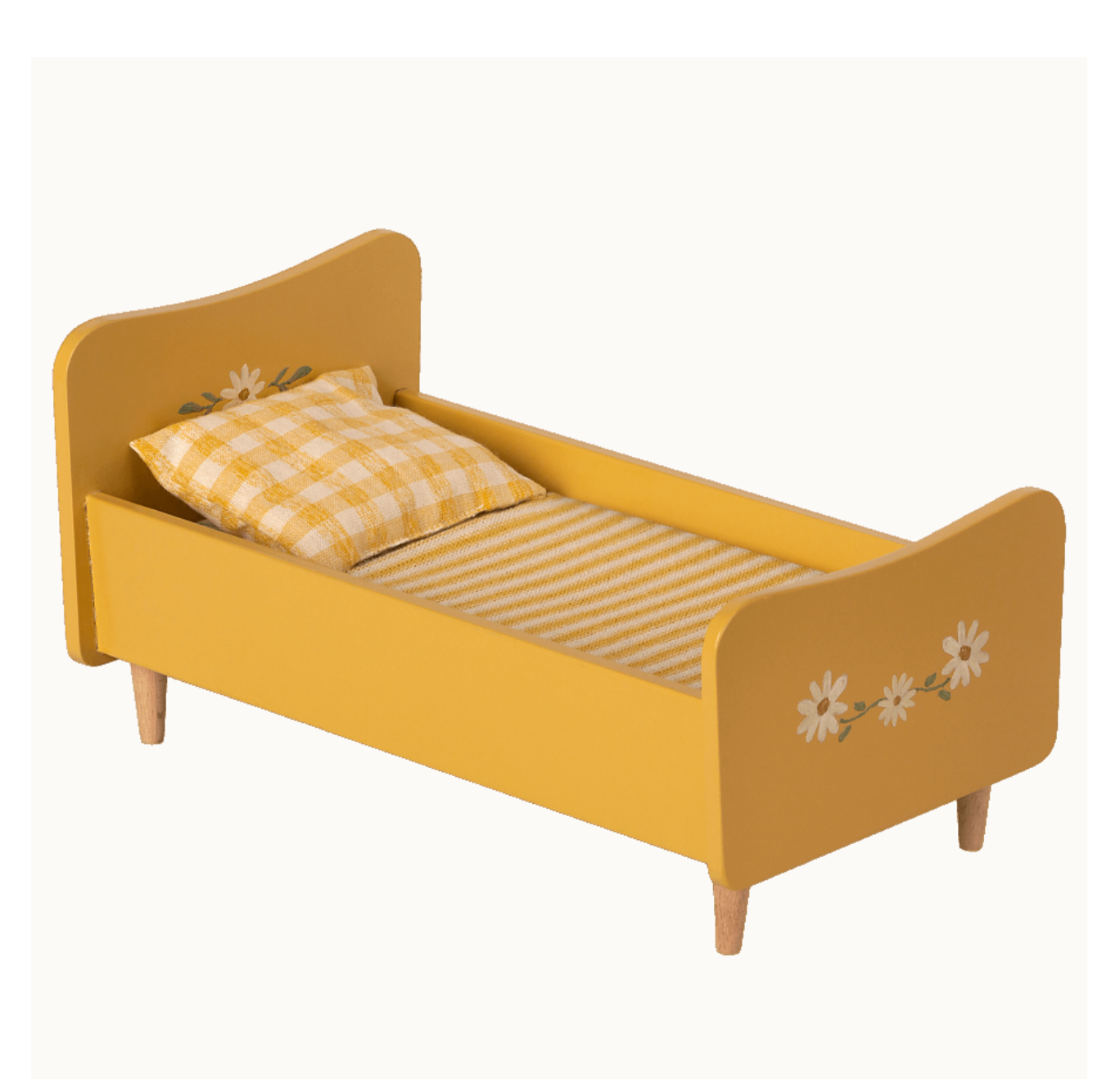 A wooden bed that fits bunnies and rabbits in size 1 and 2 perfectly. Beautiful handpainted details on the bed - variation may occur. Soft bedlinen, made in unique fabrics, will keep the soft friends warm all night.