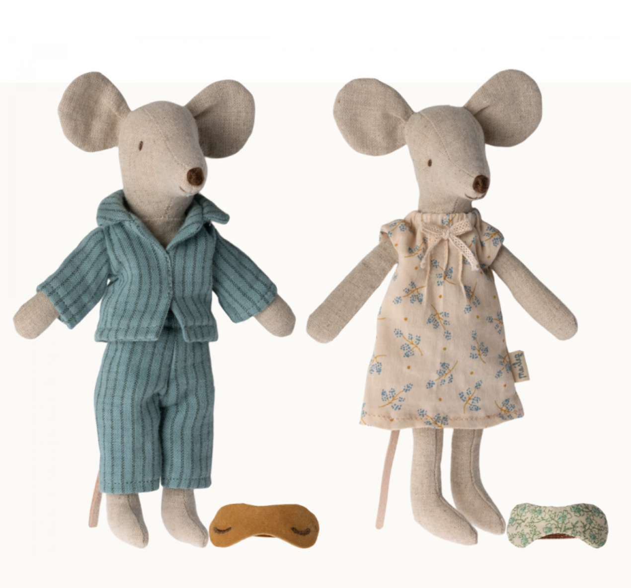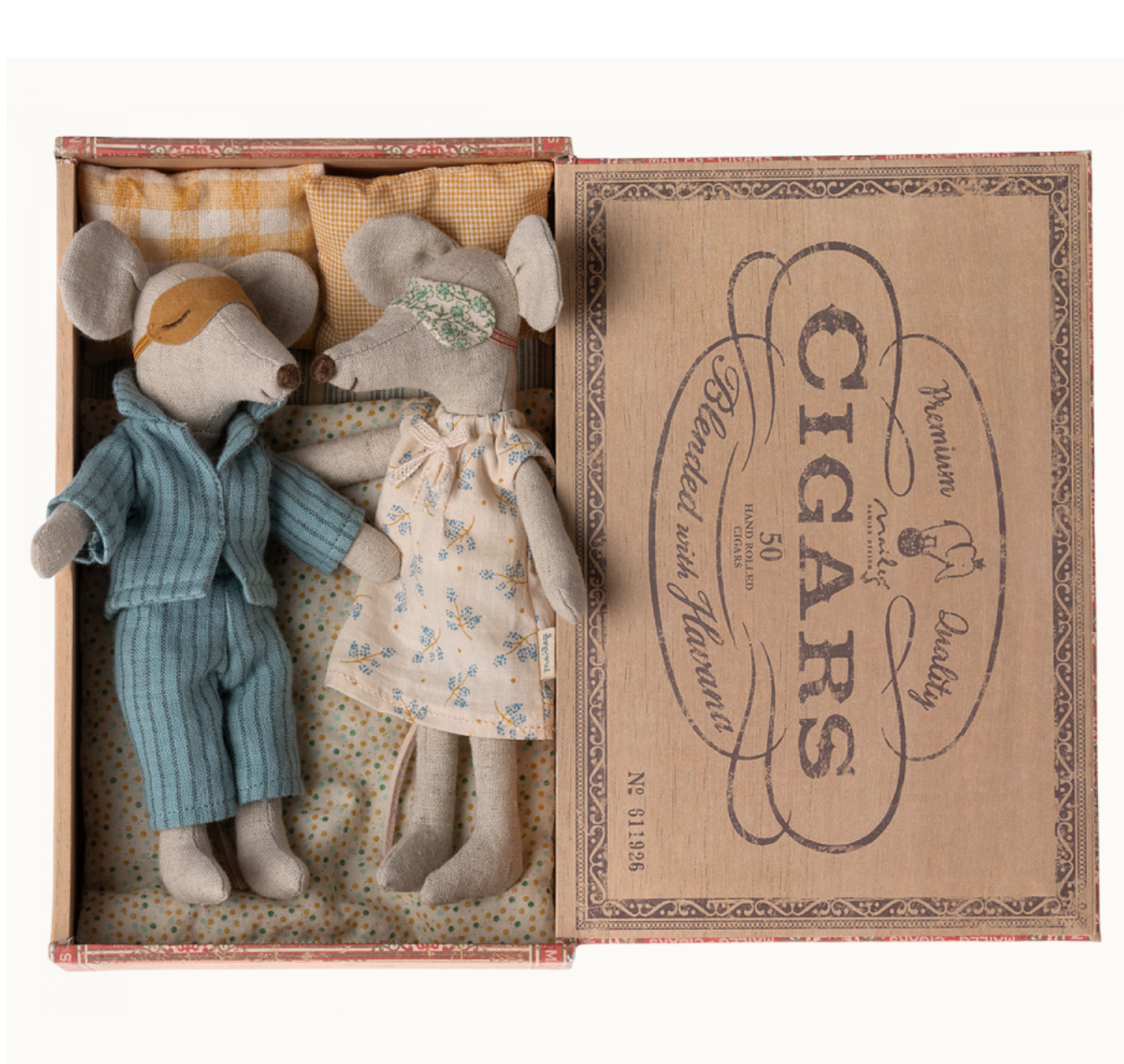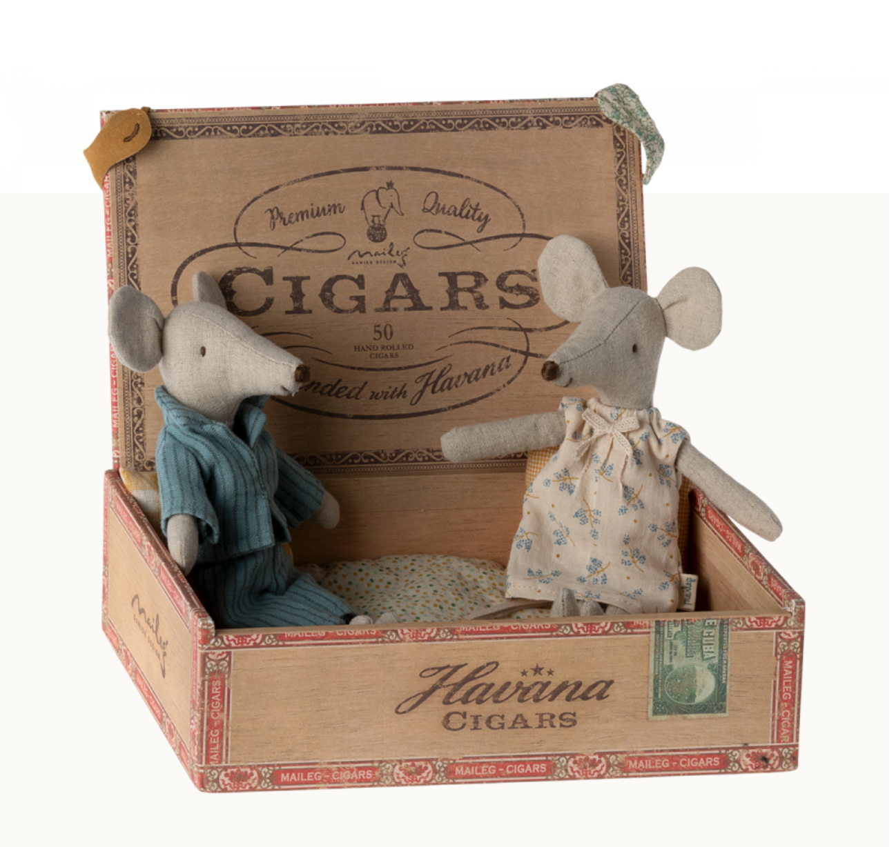 A classic Maileg item. Mum and Dad mice are wearing their beautiful nightwear and eye masks. The cigar box is a perfect bed for a good night’s sleep and sweet dreams. Bed linen may vary in colour.