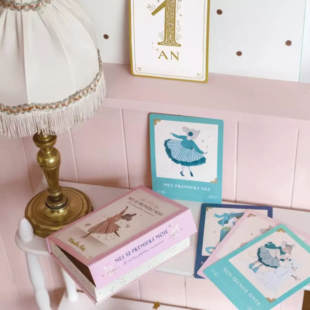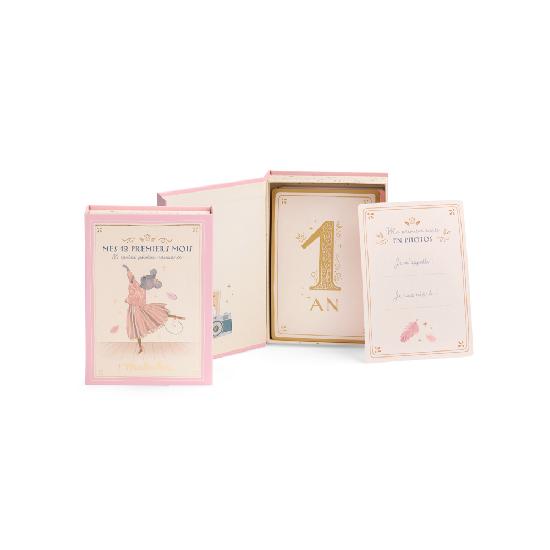 Mes 12 premiers mois de la collection La petite ecole de danse:30 cartes pour immortaliser les grandes etapes des 12 premiers mois de bebe. Photographiez bebe a cote de la carte avec l'etape illustree et collez la photo au verso, realisez un album photo original avec ses plus precieux souvenirs.