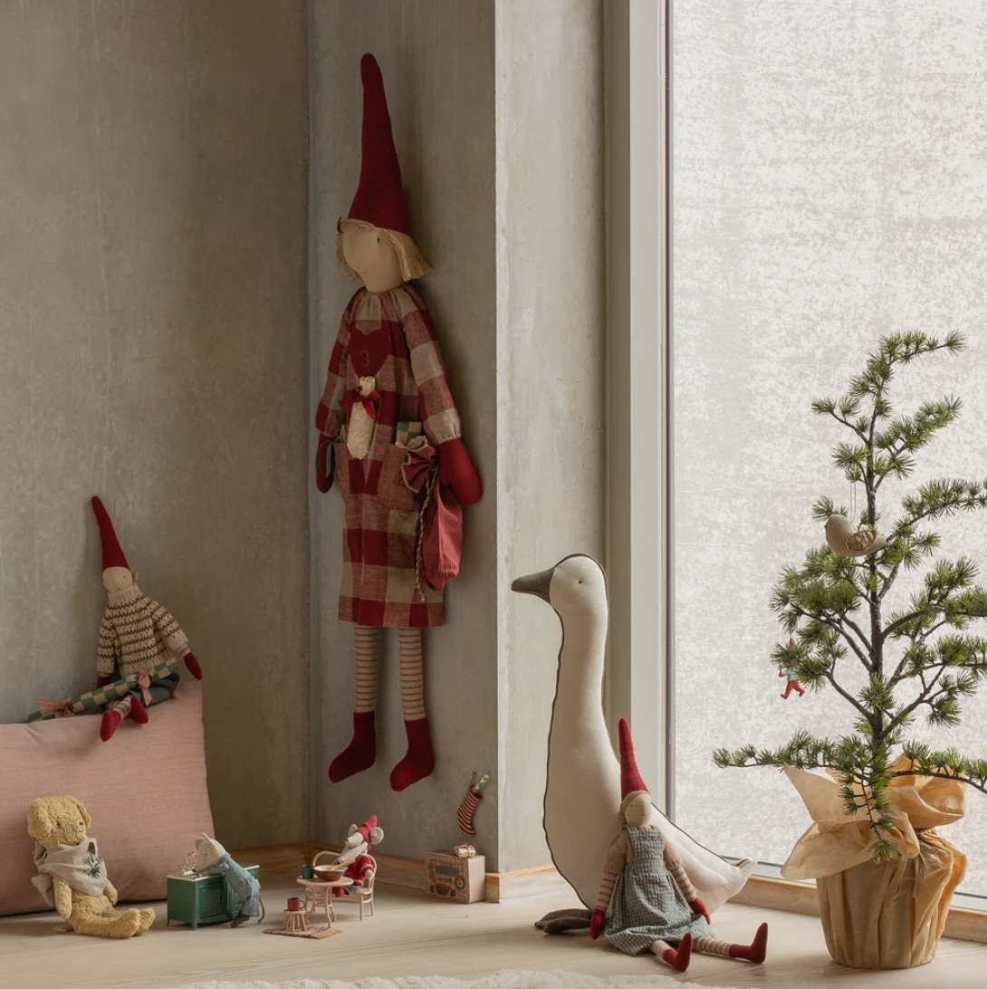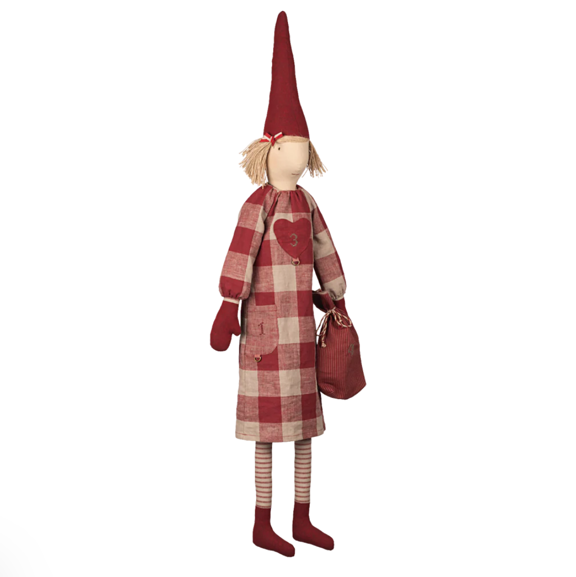 December is full of family traditions and this calendar pixy can be your next. The Advent calendar girl has 4 rings/pockets to fasten small treats - one for the 4 last Sundays before Christmas. It has a strap in the neck, so it is easy to hang up.