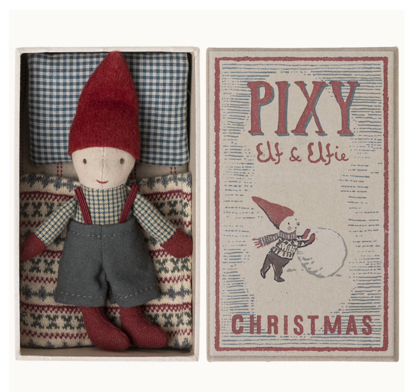 A lovely Christmas friend. Pixy Elf comes in a beautiful matchbox with soft bedding. He fits perfectly into the Christmas story.