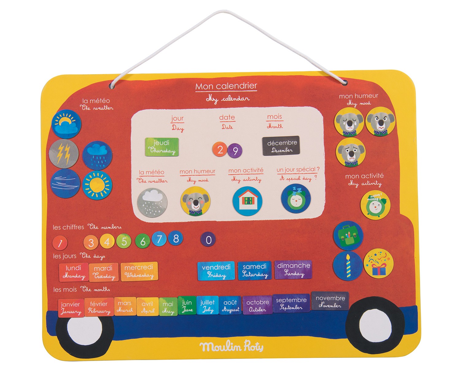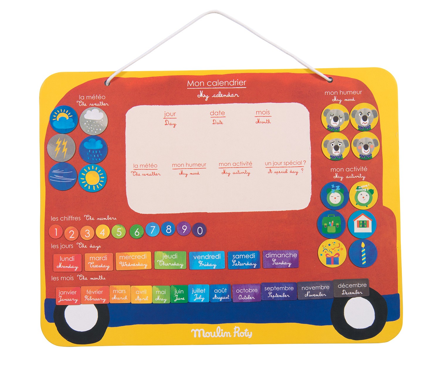 Magnetic Calendar from Moulin Roty's early learning series LES POPIPOP. Magnetized heavy cardboard calendar with secure rope for wall-hanging includes 45 magnets for: DATES, DAYS, MONTHS, WEATHER, MOODS/EMOTIONS, ACTIVITIES, and BIRTHDAYS. All labels are in both English and French. Please note the English labels are in cursive writing.