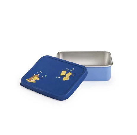 Made of high-quality stainless steel, it features a beautifully illustrated blue silicone lid. This durable container is ideal for carrying children's snacks on outings, to school, or while walking.