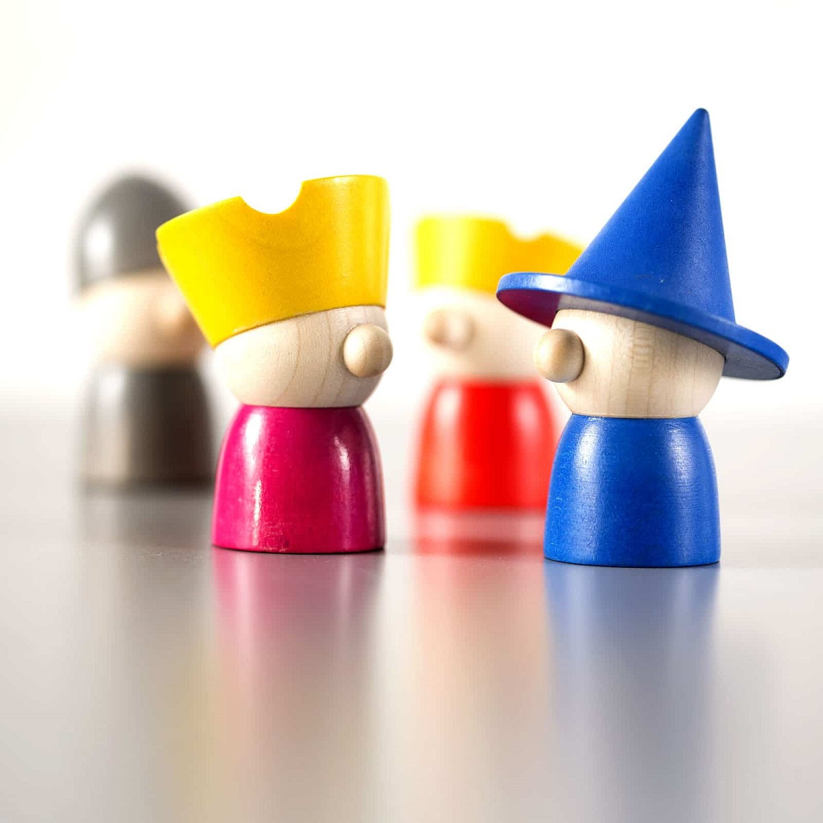 Wooden finger puppets for telling stories. Once upon a time there was a castle, with kings, queens, gallants knights and magical characters.... Make the theatre out of the cardboard, slip the Storytellers onto your fingers and invent fantastical stories by yourself or with friends. These finger puppets help children and adults unlock their imagination and invent fabulous tales.