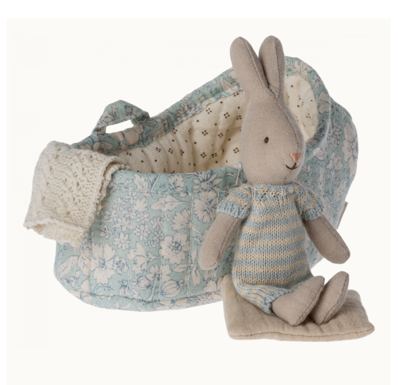 This playset is the perfect start to any story. A soft carry cot made in a beautiful fabric where the small bunny in colorful suit can easily be tucked for a nap, covered in the knitted blanket to keep warm.