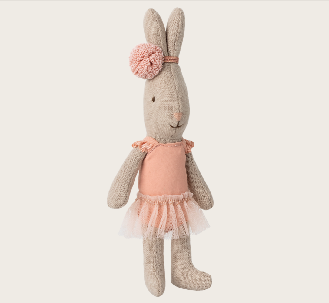 The well known Maileg micro bunny dressed up as a ballet dancer. It wears a suit and tulle skirt and has a small decoration around the pointing ears.