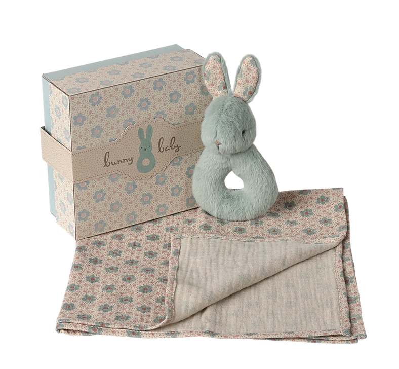 A perfect gift idea for the little ones. The set includes a soft cotton cloth and a small rabbit rattle. The rabbit has a small rattle inside that makes a soft sound. It all comes in a beautiful gift box.