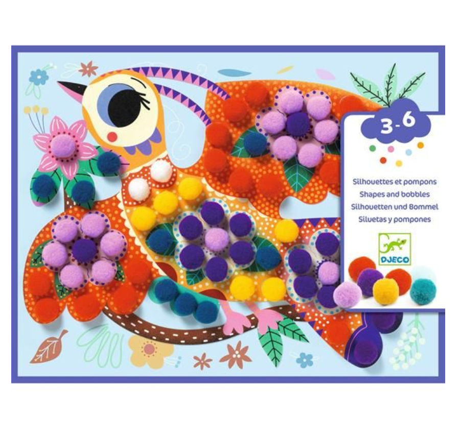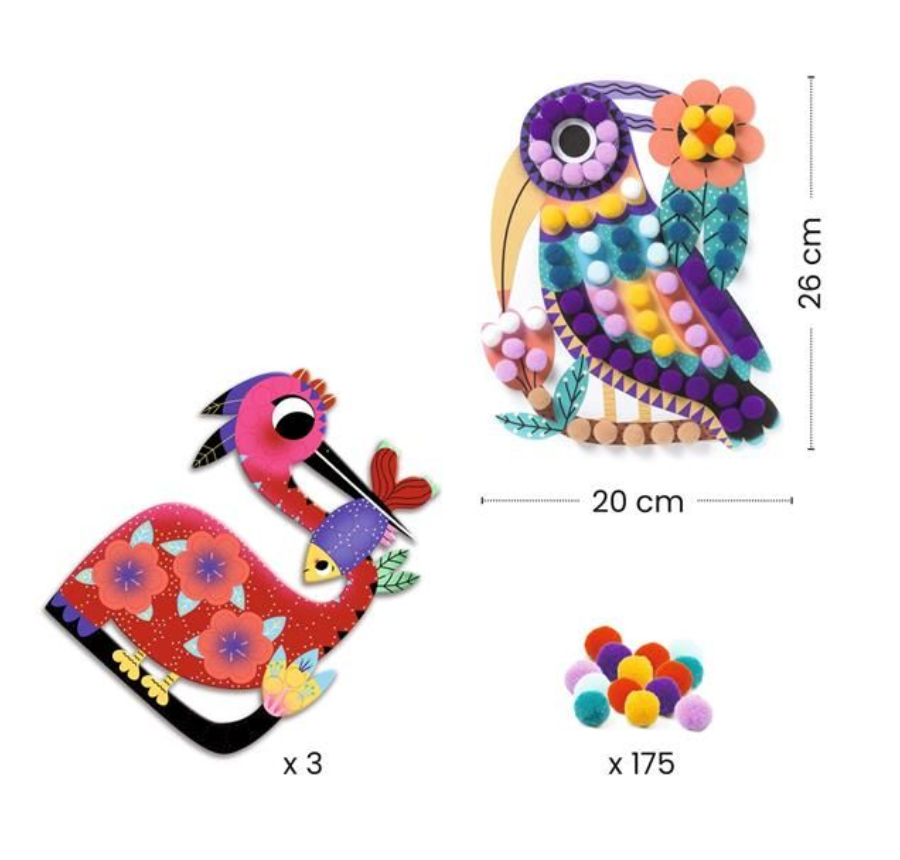 A collage activity to cover the 3 birds with soft bobbles. Following the templates in the instruction booklet, stick the coloured bobbles onto the sticky areas of the 3 shaped boards. Surprise: 3 super-soft birds appear for you to stroke!
