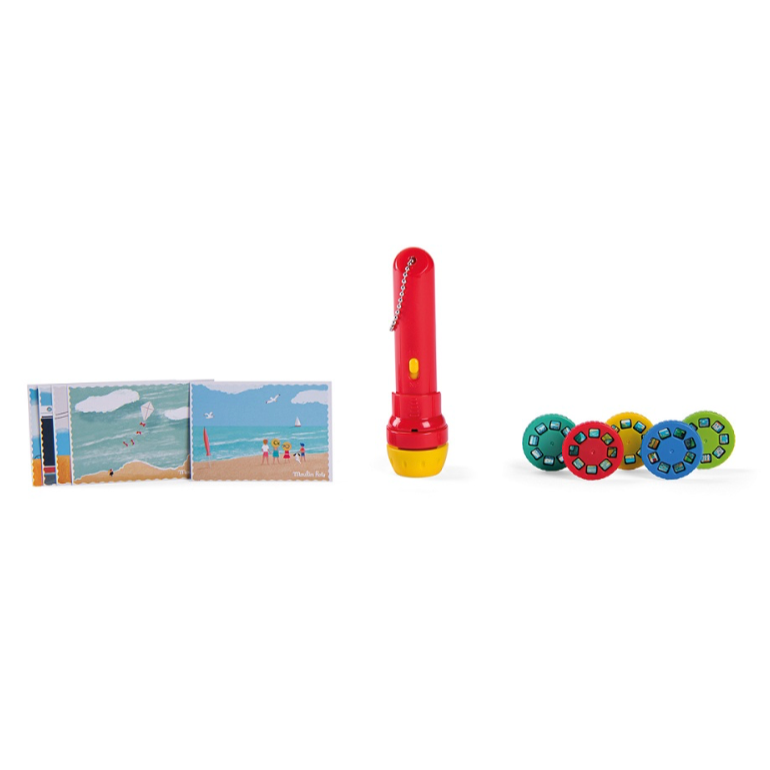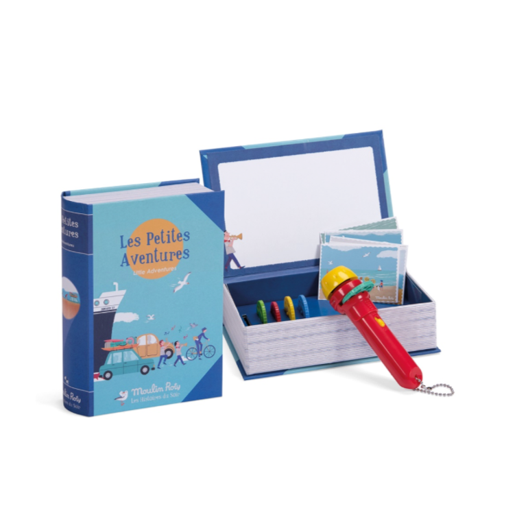 Découvrez la lampe à histoires livre Les jolies comptines de la collection Les histoires du soir de Moulin Roty, un ravissant coffret aimanté joliment illustré, conçu comme un livre pour les enfants à partir de 4 ans. Un livre magique que l'on ouvre comme une boîte à trésors, qui renferme précieusement une lampe à projeter, 5 disques et 5 cartes pour chantonner pour projeter de belles histoires sur son écran intégré. Grâce à ce joli cadeau, votre enfant pourra découvrir 5 comptines au themes Coucou Hibou, Il pleut il mouille, Vole joli papillon, Une poule sur un mur et Petit escargot.