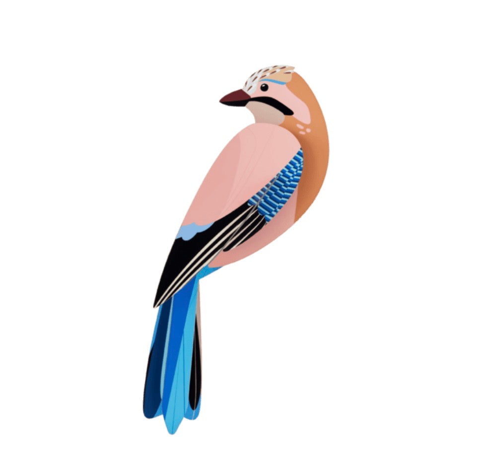 Garden birds chirp around us, pecking at some crumbs, glancing around, then fluttering away. They add color to our daily lives. This cardboard jay won’t fly away and can be given a lovely spot on your wall.