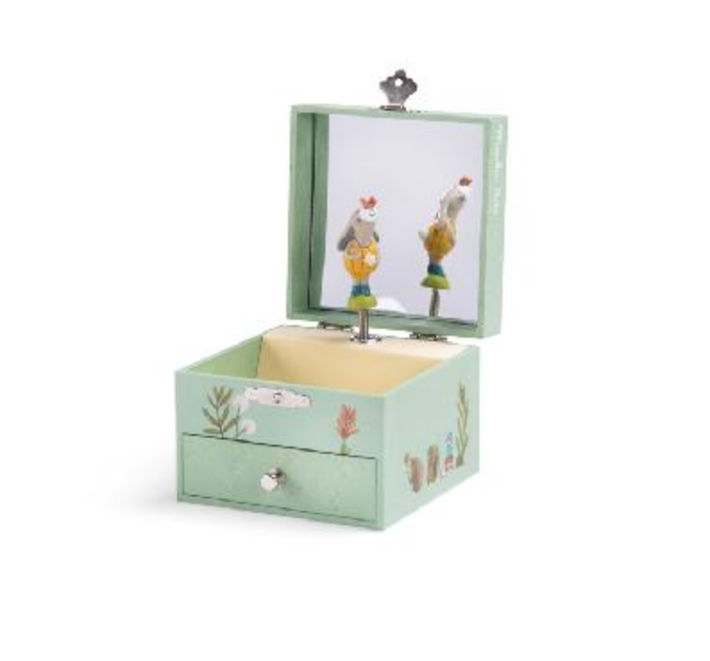 Music box set from the Trois petits lapins collection. Open the box and watch the rabbit spin around to a gentle melody, with its friend the butterfly delicately perched on the tip of its nose. There is a small drawer for storing one's treasured secrets. Measures approximately 10.5 x 10.5 x 8.5 cm. Surface washable with a humid sponge .