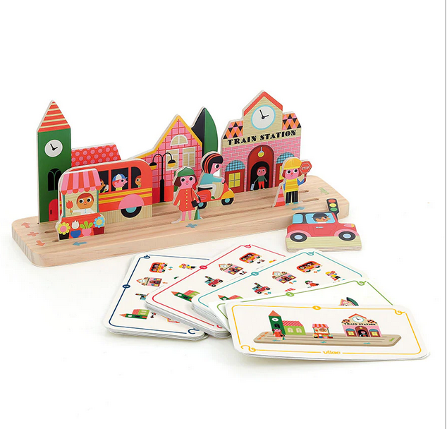 "If the scooter is placed to the left of the bus, the station must therefore be placed on the right." Our wooden "Build it" logic game, illustrated by Ingela P. Arrhenius, invites your child from 3 years old to place the wooden pieces in the right place according to challenge cards. A fun concept that will stimulate their logic, fine motor skills, sense of observation, and understanding of space (left, right, top, bottom, middle). The added bonus? Expandable challenge cards, for family play.