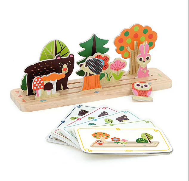 "If I place the bear on the right of the tree, the mushrooms will have to be on the left." Our wooden "Build it" logic game, illustrated by Ingela P. Arrhenius, invites your child from 3 years old to place the wooden pieces in the right place according to challenge cards. A fun concept that will stimulate their logic, fine motor skills, sense of observation, and understanding of space (left, right, top, bottom, middle). The added bonus? Expandable challenge cards, for family play.